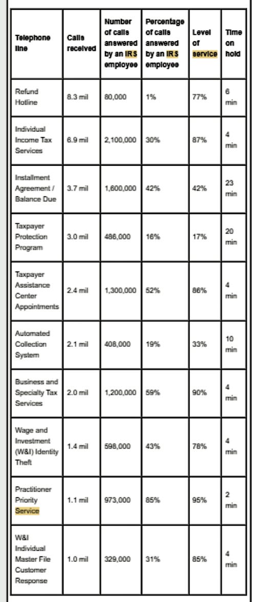 2.1 million taxpayers who called the IRS’s Automated Collection System telephone line after receiving a collection notice and who may have needed urgent help getting a levy released to alleviate an economic hardship (19% of calls were answered with a 10-minute wait time).
